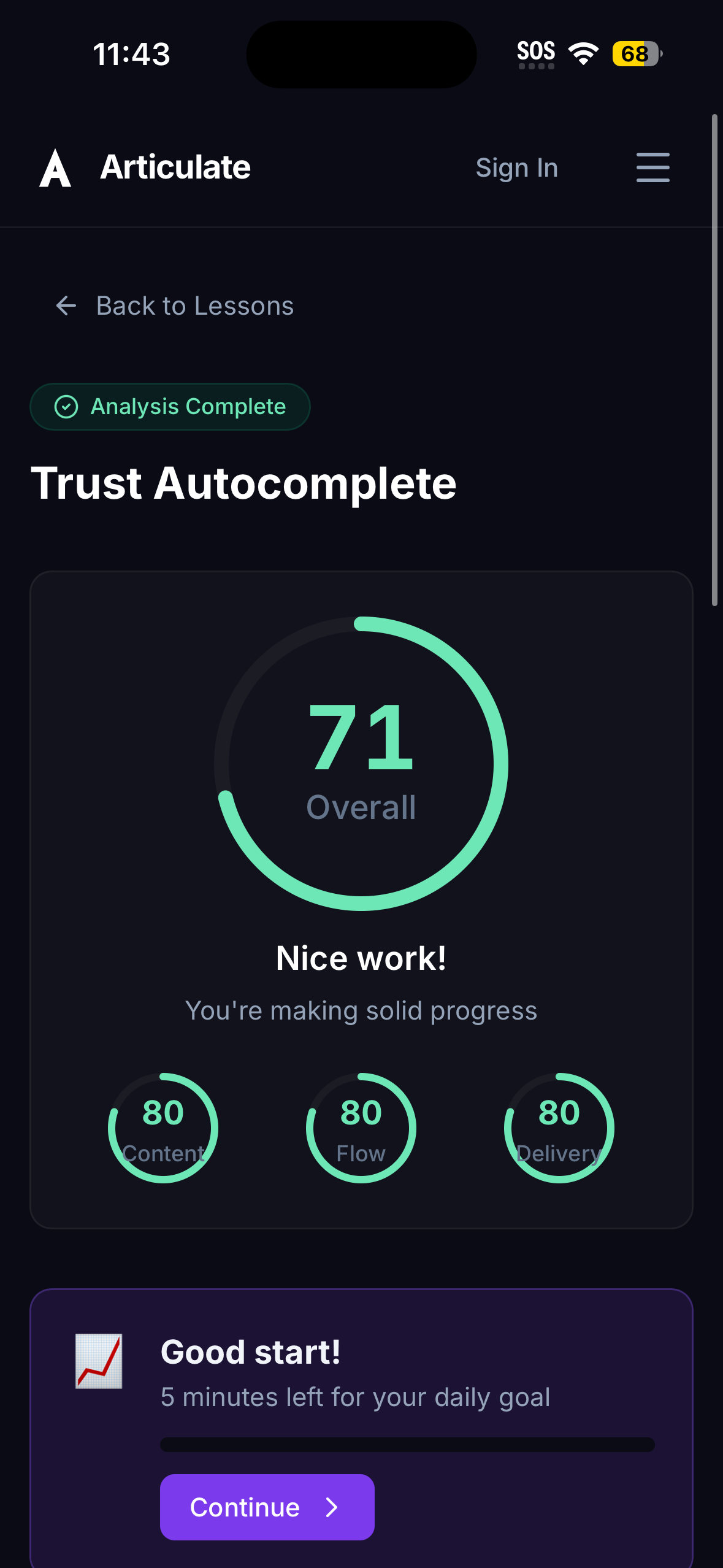 Track your streak. Watch your scores climb. Articulate turns speaking practice into a daily habit — with a score progression chart that proves you're getting better.